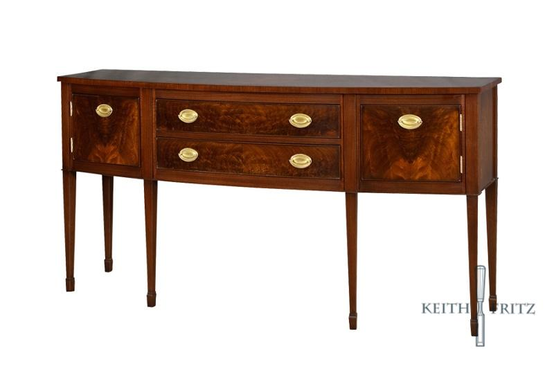 A notable style of light, elegant furniture that was fashionable between about 1775 and 1800, Hepplewhite designs are poised, slender shapes with a modest curvilinear physique. With straight legs that taper down to spade feet, this server is a faithful reproduction of balance and geometry. The gentle bow front embellishes the metameristic qualities of the exquisite crotch walnut allowing the light to play across the wood characteristics like ocean waves. The server also boasts the delicate detail of cock beading on the edge of all the doors and drawer fronts as well as traditional brass oval bails which are a distinctive adornment to this style.