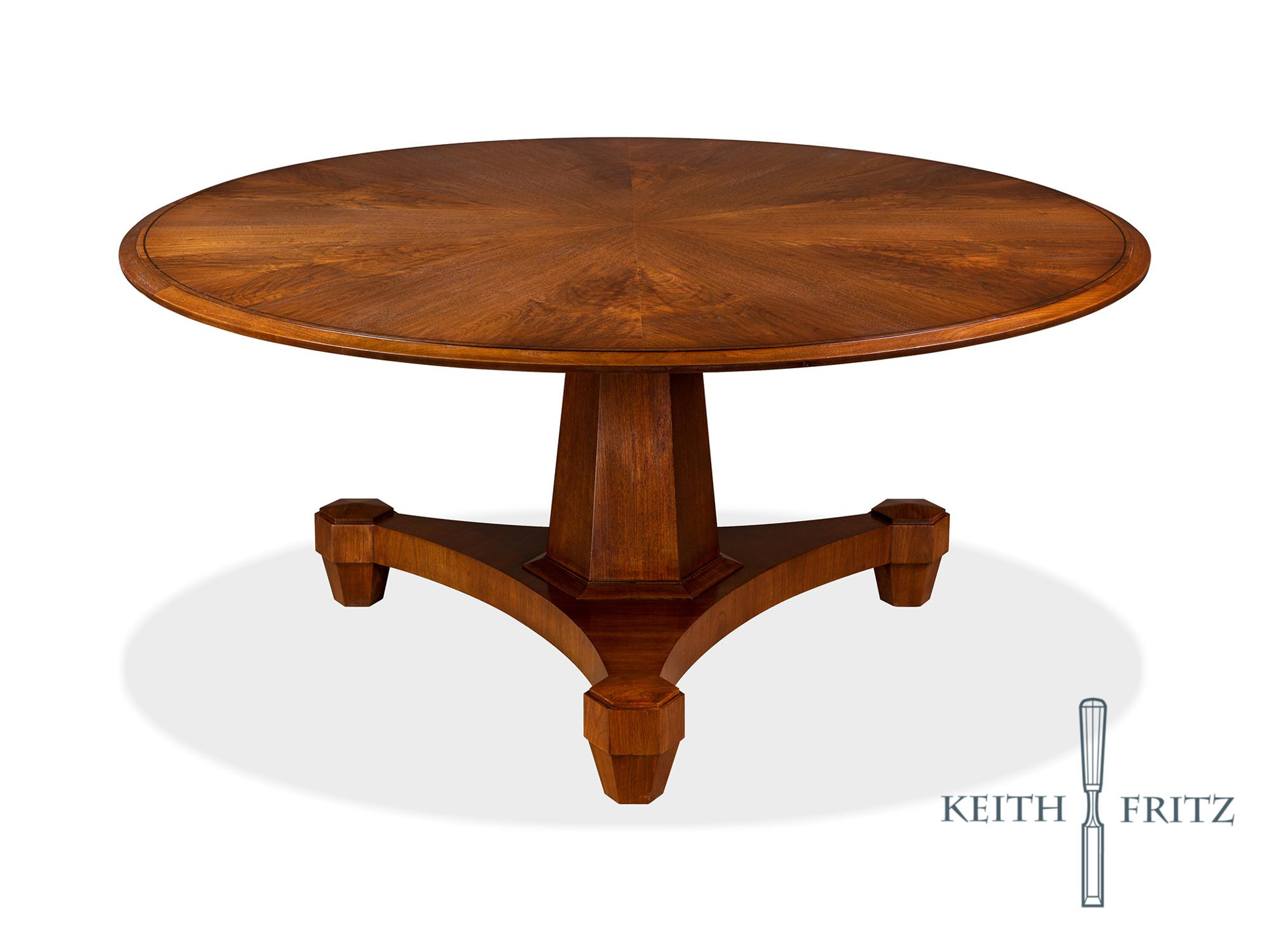 We fused a traditional Neo-Classical form with Art Deco geometry for this table. Blended, the elements from both schools collaborate seamlessly to give the whole piece a sense of unity and simplicity. Shown here (primary single pedestal image) in a hand-planed figured walnut with a beveled edge.