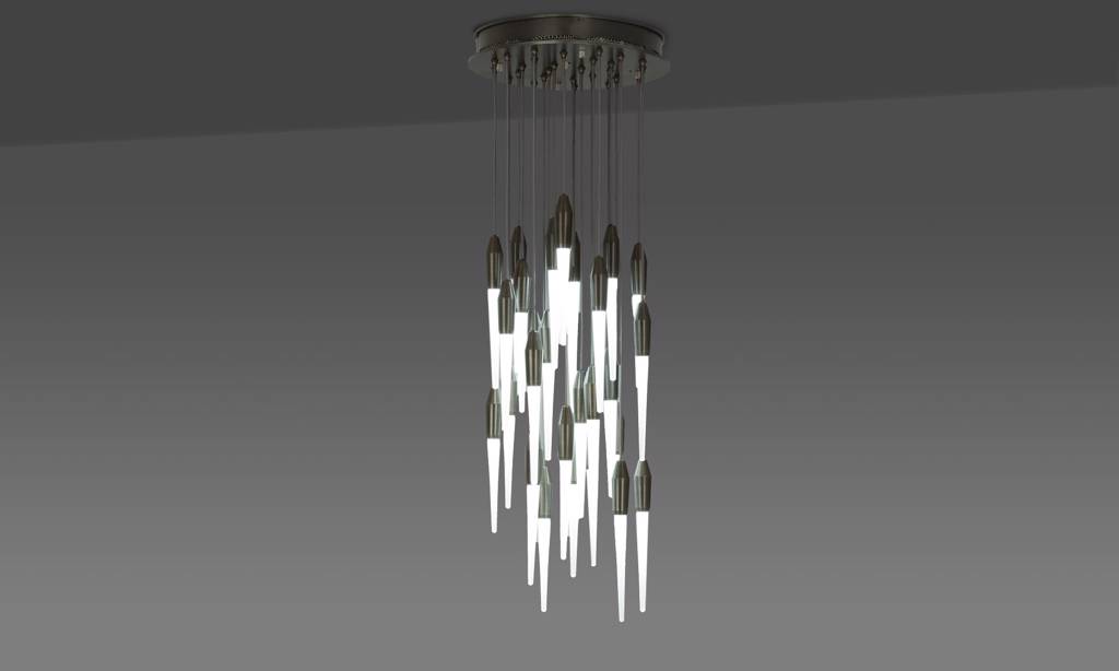 A modern take on the chandelier, this LED flush mount ceiling fixture designed by architect Tom Nahabedian features an arresting shower of Icicles. Nominated for a Best of Year award from Interior Design and perfect for big drama, it comes in two sizes, six metal finish options, and seven cord color options, and can be configured in any combination of sparkling clear glass or soft etched glass. Patent Designs: D763,500. D804,716. D766,500.