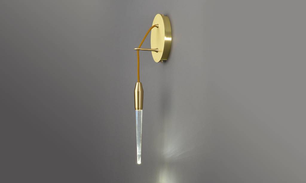 From Chicago architect Tom Nahabedian, the Icicle Drop Sconce ADA makes a subtle yet sexy statement providing glowing, ambient light. Available in six metal finish options, six cord color options, and either clear or etched glass drop. Patent Designs: D763,500. D804,716. D766,500.