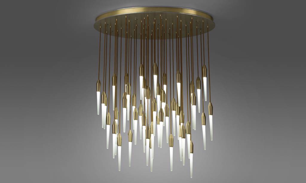 A modern take on the chandelier, this LED flush mount ceiling fixture designed by architect Tom Nahabedian features an arresting shower of Icicles. Nominated for a Best of Year award from Interior Design and perfect for big drama, it comes in two sizes, six metal finish options, and seven cord color options, and can be configured in any combination of sparkling clear glass or soft etched glass. Patent Designs: D763,500. D804,716. D766,500.