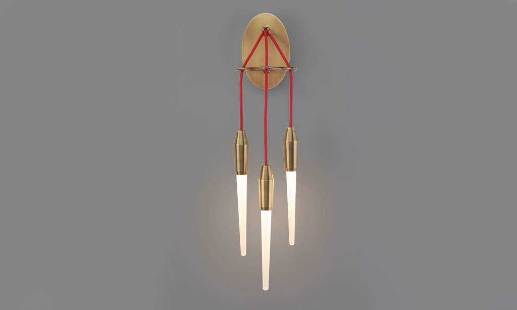 From Chicago architect Tom Nahabedian, the Icicle Triple Sconce is a natural progression from the original Icicle Drop Sconce, while providing more volume and lumen output. Available in six metal finish options, seven cord color options, and either clear or etched glass drops. Patent Designs: D763,500. D804,716. D766,500.