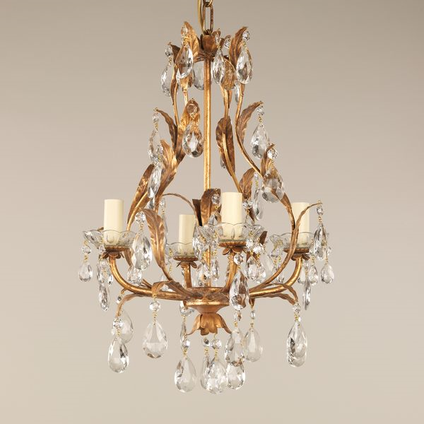 The curved shape defines this highly decorative chandelier. The combination of the intricate pressed steel leaves with the faceted glass and crystal drops, reflects light beautifully.Gilt