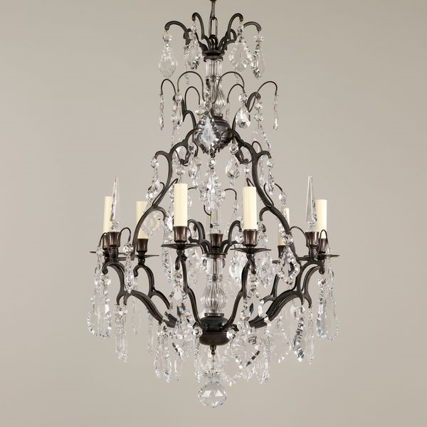 This elegant chandelier is based on a French 18th century design. Each crystal drop is hand-cut, including the central crystal ball finial suspended from the bronze frame. The Kington Chandelier matches our Cluny Wall Light.