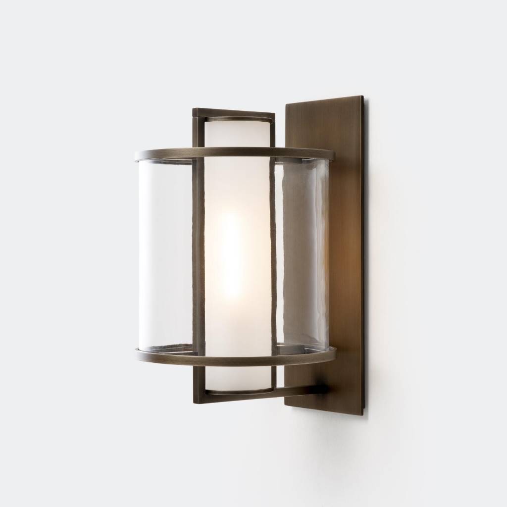 Kevin Reilly’s Klos Sconce boasts a curvaceous yet tailored silhouette, with a circular exterior mouth-blown glass shade encircling a center cylinder of mouth-blown frosted glass. Both feature architectural framework and a backplate of handcrafted steel. Suitable for indoor or outdoor use, with 14 standard sizes and the ability to customize.