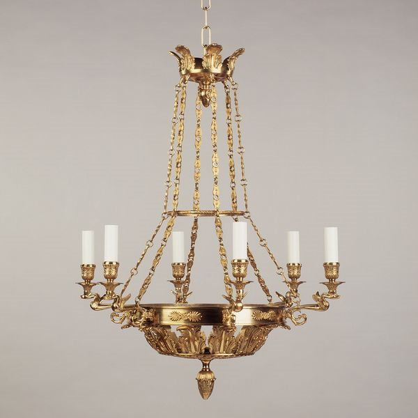 Based on a 19th century French Empire chandelier, the arrangement of the chains and the elaborate cast brass details make this design distinctive. The gilt finish will age beautifully over time.