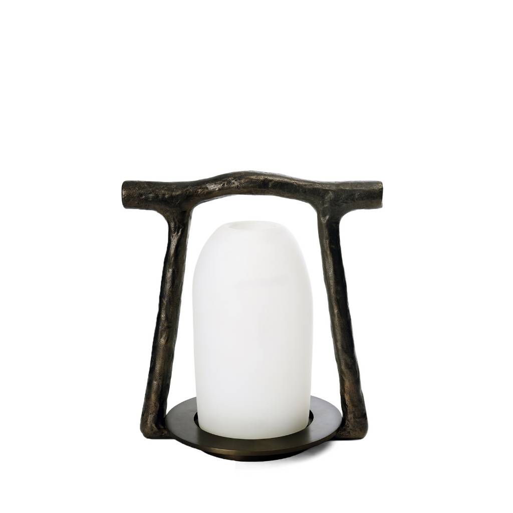 The Mezzo lamp was conceived to respond to a desire for nomadic and easy-to-live-with objects that can be moved from one room to another, and to go outside on a terrace, garden table, or yacht deck. The Mezzo reflects the Liaigre concept of a lifestyle that is casual and does not succumb to a desire for only beauty. Unlike many nomadic objects, often made of ordinary materials, the Mezzo meets quality and durability requirements that are expressed through each of our designs. The Mezzo is made of magnificent, sculpted, patinated bronze and an opal glass reflector blown by a master glassmaker. The result is exceptional. It can be battery operated or wired, offering many possibilities.