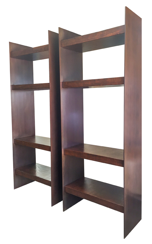 A powerful and sculptural étagère, fabricated from naturally finished solid sheet steel it features shelves of solid, hand-cut spruce. The design lends itself to accommodate any scale. Originally designed to house a client's magic collection.