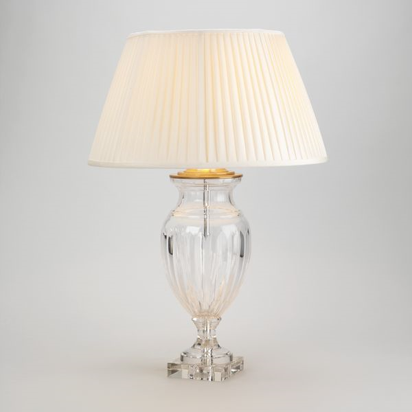 Based on an antique crystal vase we admired, this lamp is finely crafted from glass. The combination of the faceted rounded shape and the square base create its delicate form.Glass (Brass)