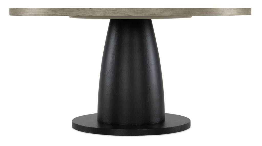 Product Description: Organic, rustic and modern, the Blue Ridge Round Dining Table features a two-tone finish combining a textured black pedestal base with a top in the soft smoked gray Mink color. Crafted of Oak Veneers, the 60-inch round shape invites conversation and connection.
