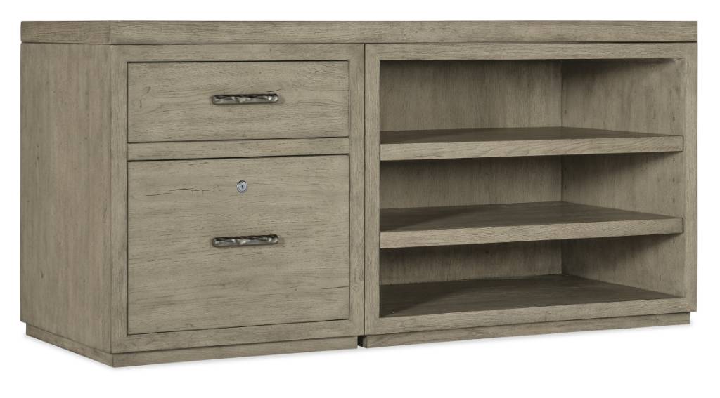 Product Description: Capturing the essence of nature’s organic color palette on a clean-lined, simple silhouette, the Linville Falls Credenza fuels inspiration with streamlined organization. Crafted of Oak Veneers with a soft smoked gray Mink finish, the room 60-inch wide top has a functional base including a small file on one side and an open desk cabinet on the other. There are two drawers with the top drawer serving as a utility drawer and the lower drawer having a locking file with pendaflex filing system. The roomy desk cabinet has 2 adjustable shelves. The credenza is fully finished on the back so it can be floated in a room.
