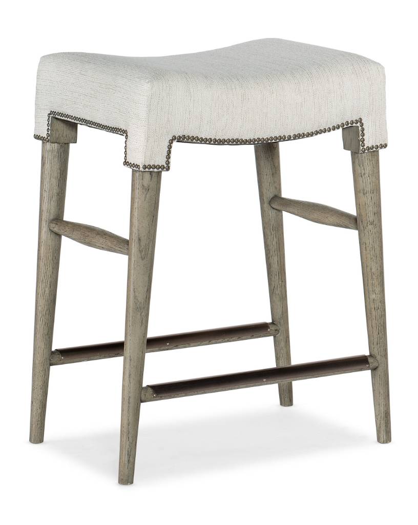 Product Description: Nostalgic and chic with the aura of a rustic mountain cottage, the Green Valley Counter Stool has a wood frame in a rectangle shape finished in the smoked gray Mink color, and a fabric seat covered in the neutral performance texture Remington Porcelain. Nailhead trim gives a designer touch.