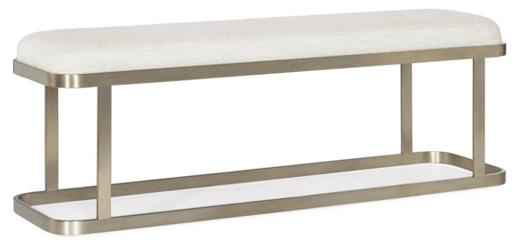 Product Description: Combining a cozy upholstered seat with a sleek metal base in a champagne finish, the River Branch Bench is chic, modern and inviting. The seat is upholstered the Merino Pearl performance fabric.