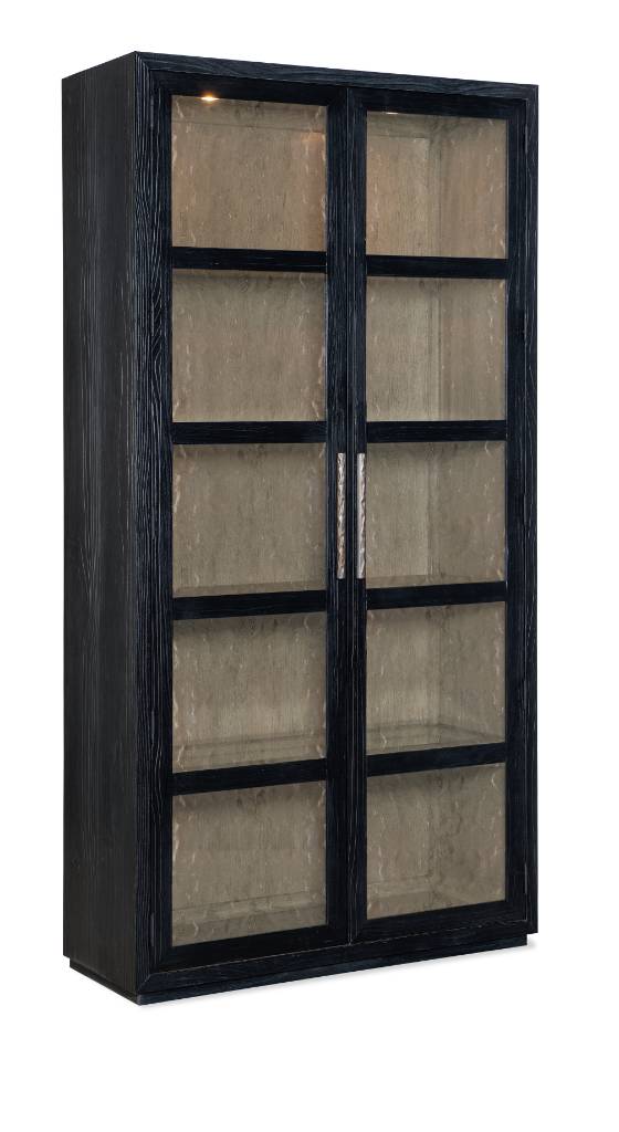 Product Description: With the aura of a rustic mountain cottage, the Linville Falls Curio Cabinet has two wood-framed doors with seeded glass inserts. Crafted of Pine Veneers, the cabinet has a charred black finish achieved through Shou Sugi Ban, a Japanese technique that creates a look resembling burnt wood. The interior is finished in Mink, a soft smoked gray. There are three adjustable wood-framed glass shelves, one fixed wood-framed glass shelf and two puck lights in the top with a three-intensity touch switch on the right side back panel. Textured metal bar pulls have an antique pewter finish.