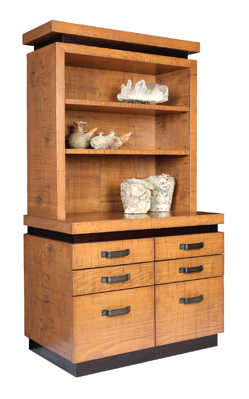 Part of our popular "Logan" series, customizable piece fabricated from spruce, features adjustable shelving above and multiple drawers below. Flame-cut steel handles complete the piece. Available in any configuration and in any standard MLI finish.