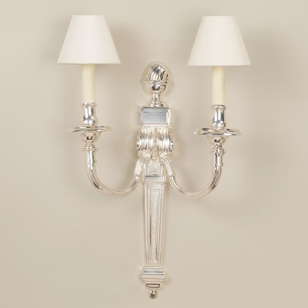 Based on an antique Louis XVI piece we discovered in Paris, this wall light is made out of solid cast brass with a silver finish. Its simple design and patterned detailing are hallmarks of its success.
