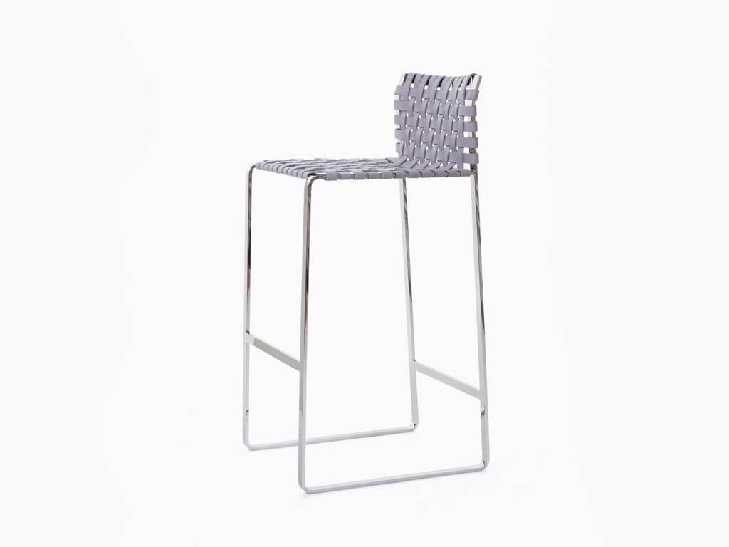 The Low Woven Back Stool combines the comfort of a woven leather back with a streamlined profile that remains under the sight line of the counter or bar.