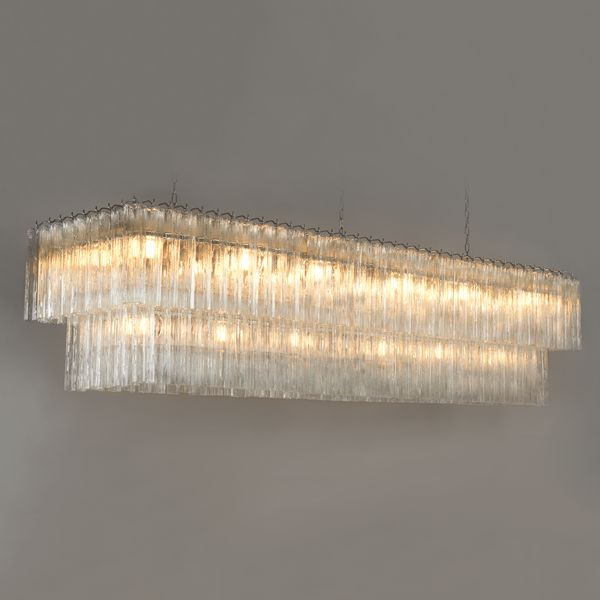 The chandelier is decorative with a classic line, and hand-textured glass cylinders cascade from the rectangular frame to radiate and refract light.Glass (Rectangular)