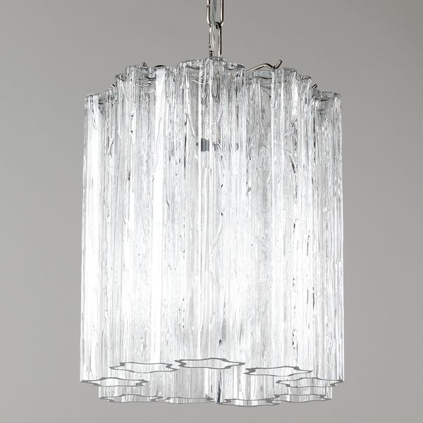 The chandelier is decorative with a classic line, and hand-textured glass cylinders cascading from the frame to radiate and refract light. The tiers can be specified to produce the chandelier in a variety of sizes.