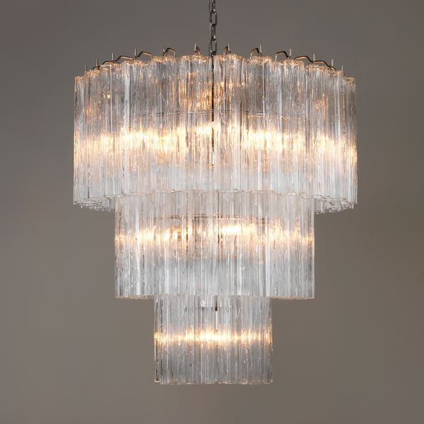 This chandelier is decorative with a classic line. The hand-textured glass cylinders cascade from the frame to radiate and refract light. The tiers can be specified to produce the chandelier in a variety of sizes.Glass (3 tier)