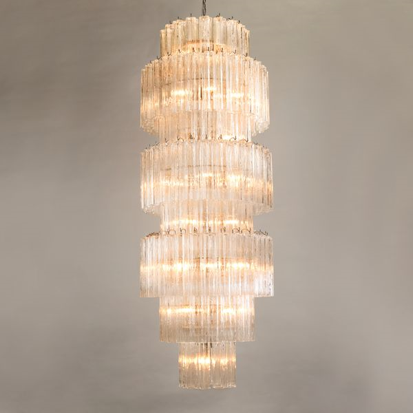 The chandelier is decorative with a classic line, and hand-textured glass cylinders cascading from the frame to radiate and refract light. The tiers can be specified to produce the Chandelier in a variety of sizes.