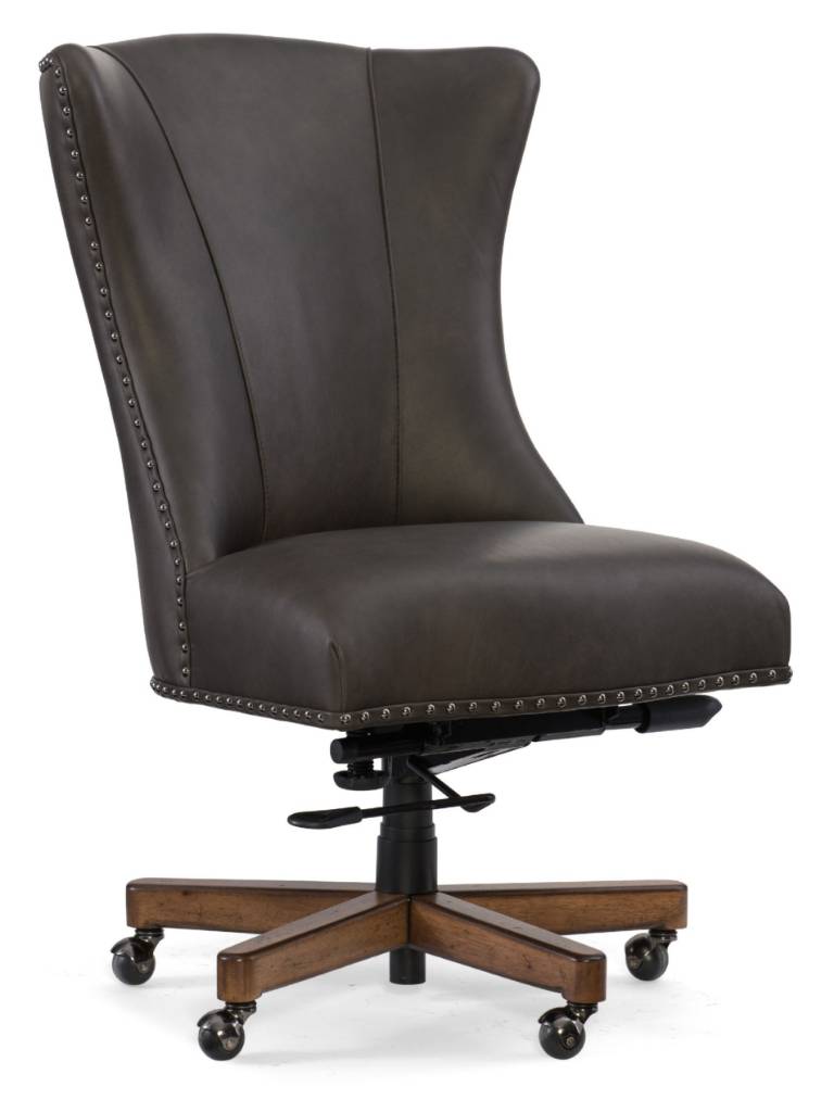 Product Description: Chic in a clean and simple silhouette, the armless Lynn Executive Swivel Tilt Chair with casters flexes while you work to give you mobility to swivel, tilt and roll. Covered in the Caruso Naples finished top-grain leather, the Lynn features vertical channels on the back, shaped wings and nailhead trim down the sides and seat. The base is in a Chestnut wood finish.