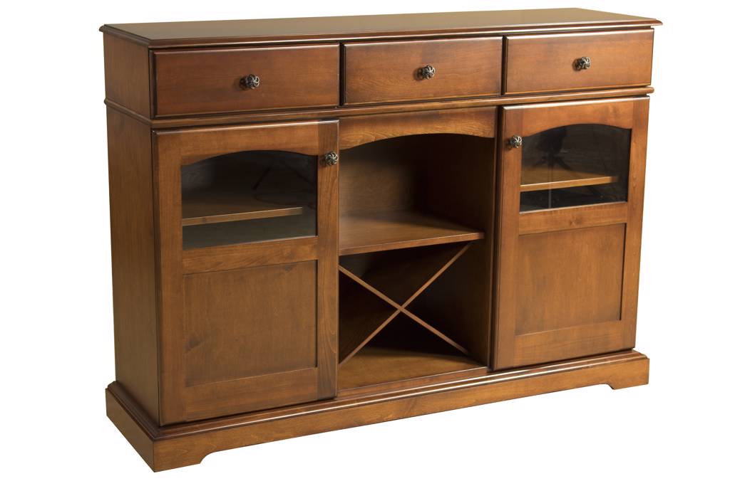 Maple Traditional Credenza with 2 doors with glass windows, 3 drawers Open center with removable wine rack Antique black knobs, 1 fixed center shelf and 4 adjustable shelves
