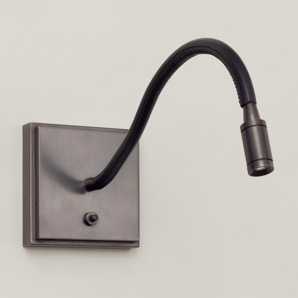 This expertly crafted reading light has a highly flexible goose neck arm and the leather covering adds luxurious depth and texture. The small button on the backplate is an intricate, functional detail. The design is discreet and simply elegant.