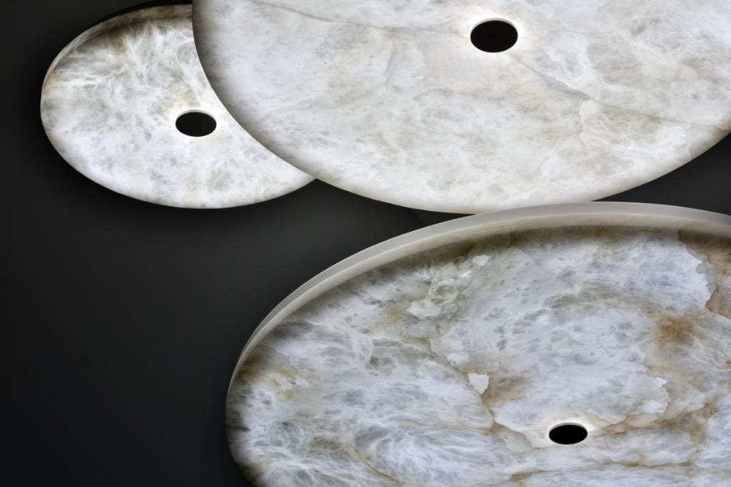 The Manhattan Pendant features a minimalist disc hanging from a clean-lined metal structure. Crafted using innovative techniques, the alabaster light shines with a bold radiance despite its streamlined form. Whether hanging alone or as part of a cluster, it creates a captivating plane of ambient light above any interior setting.