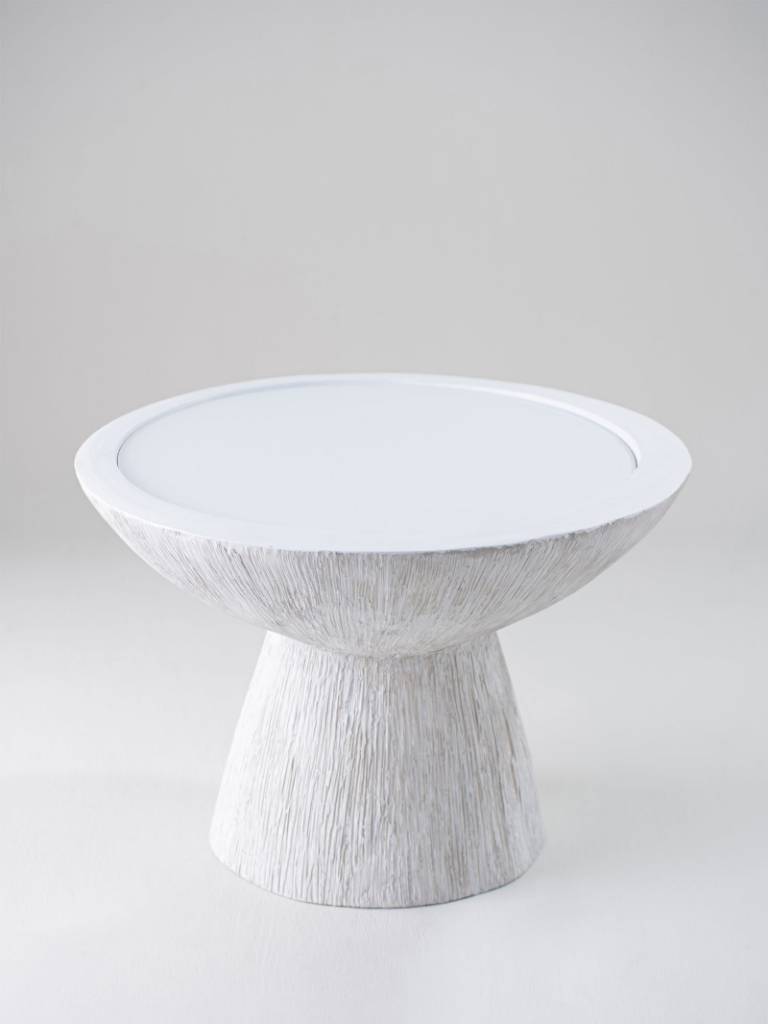 The Marina Side Table was designed by Gareth Devonald Smith. Marina, of the sea, from a submerged ancient temple, and cut from rock, light in appearance but bold and strong in form.