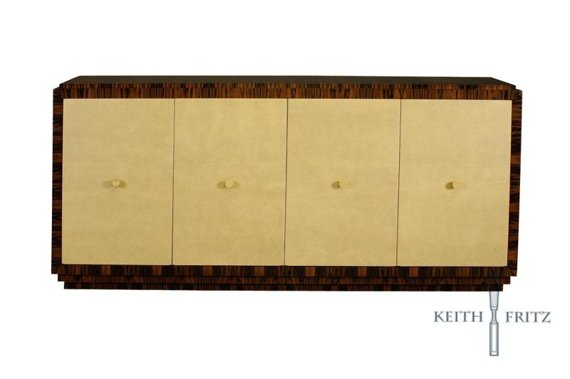 Drawing from the works of 20th Century French masters like Jean-Michel Frank, this clean, Deco credenza is ideal for storing TV components and makes for an excellent server. The piece is shown here in Natural Santos Rosewood and Faux Ostrich sliding doors with stitched seams and flush nickel pulls.