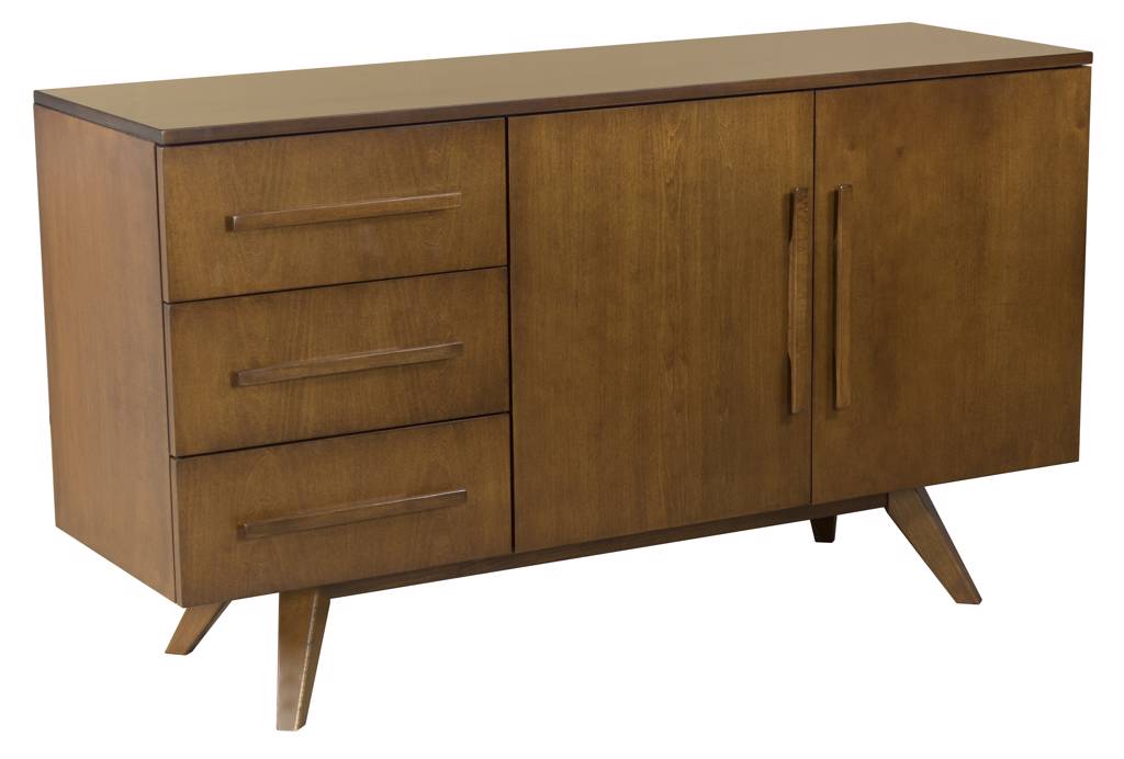 57-inch buffet, 2-door, 3-drawer, solid maple top, long wood handles, splayed foot