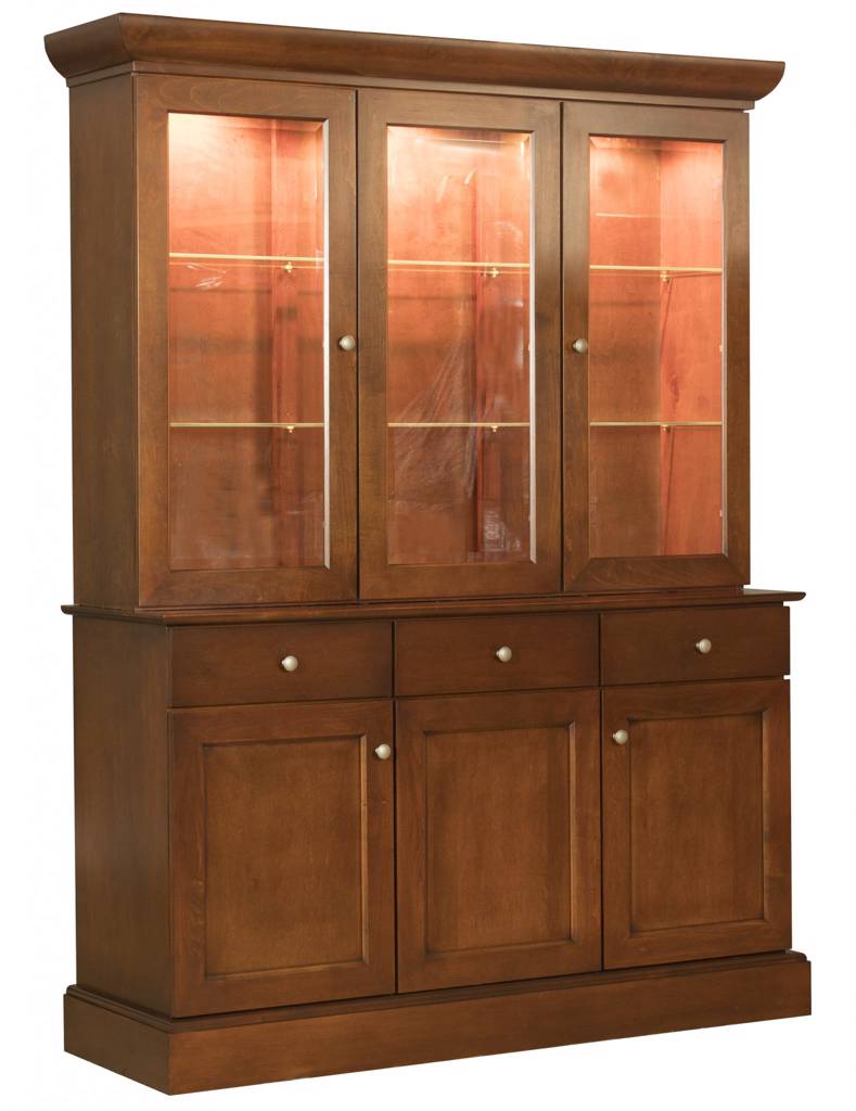 60-inch china top, 3-door, with interior lights, pewter knobs, 2 adjustable glass shelves