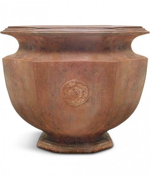 overall dimensions: 27”dia x 24½”h interior at top: 17½”d x 17½”w x 21”h interior at bottom: 16”dia x 21”hindoor/outdoorstandard size only220 lbsantique terracottacast stone