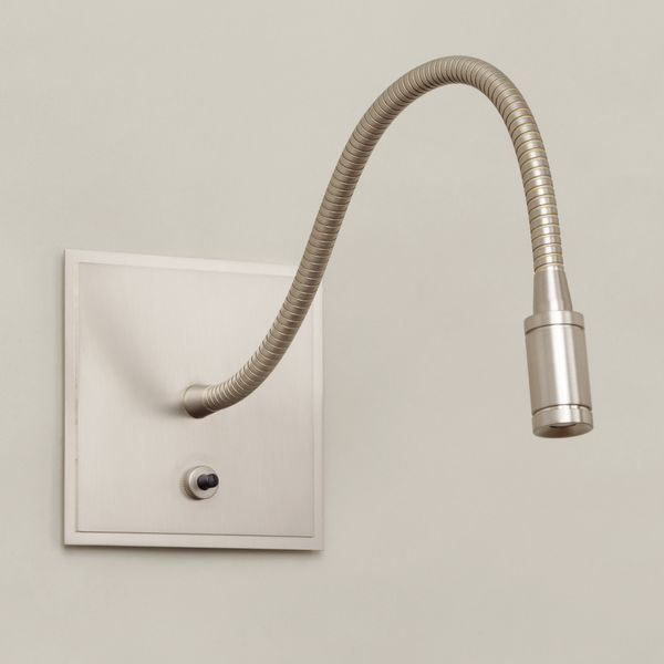 This reading light has a flexible goose neck arm. The small button on the backplate is an elegant, functional detail. Expertly crafted from solid brass and finished in a brushed nickel finish, the design is discreet and elegant.