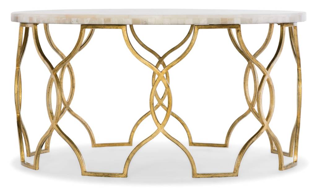 Product Description: Light and airy, sleek and chic, the Corrina Cocktail Table is distinguished by a delicate fretwork metal base in a gold leaf finish topped by a round white onyx top of organic elegance.