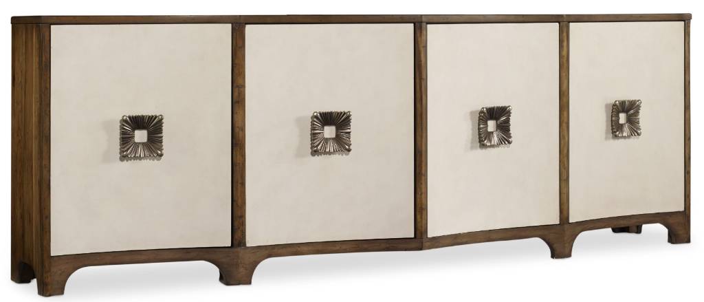 Product Description: The Mélange credenza has four doors with large square hardware. It can also be used as an entertainment console.