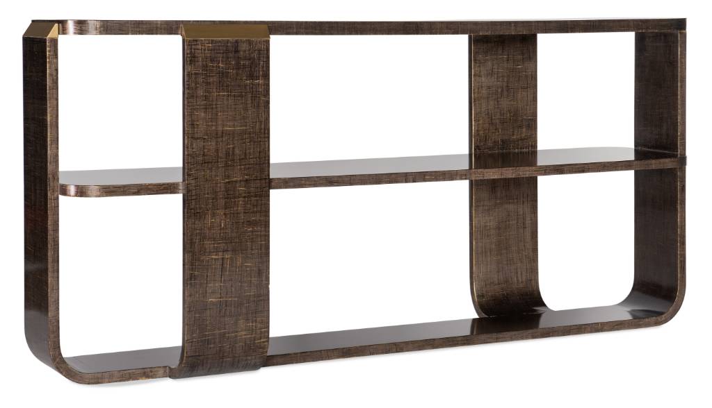 Product Description: With a unique silhouette, rich finish and metal accents, the Edmun Sofa Table is a striking addition to any living space. Featuring a rectangle shape with rounded edges, the table is crafted of Maple Veneers in a dark wood finish with metal caps. One fixed shelf in the center.