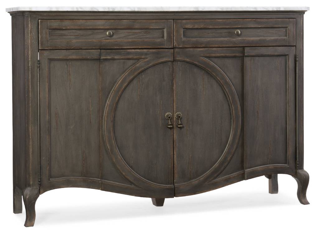 Product Description: This chic and shapely credenza has a raised circle motif that dissects the center doors, classic cabriole legs and an elegant marble top. Almost too good to be true: this gorgeous piece is TV-ready with a ventilated back panel, two adjustable shelves and two drawers and will accommodate up to a 60-inch flat screen TV. Finish is a charcoal color.