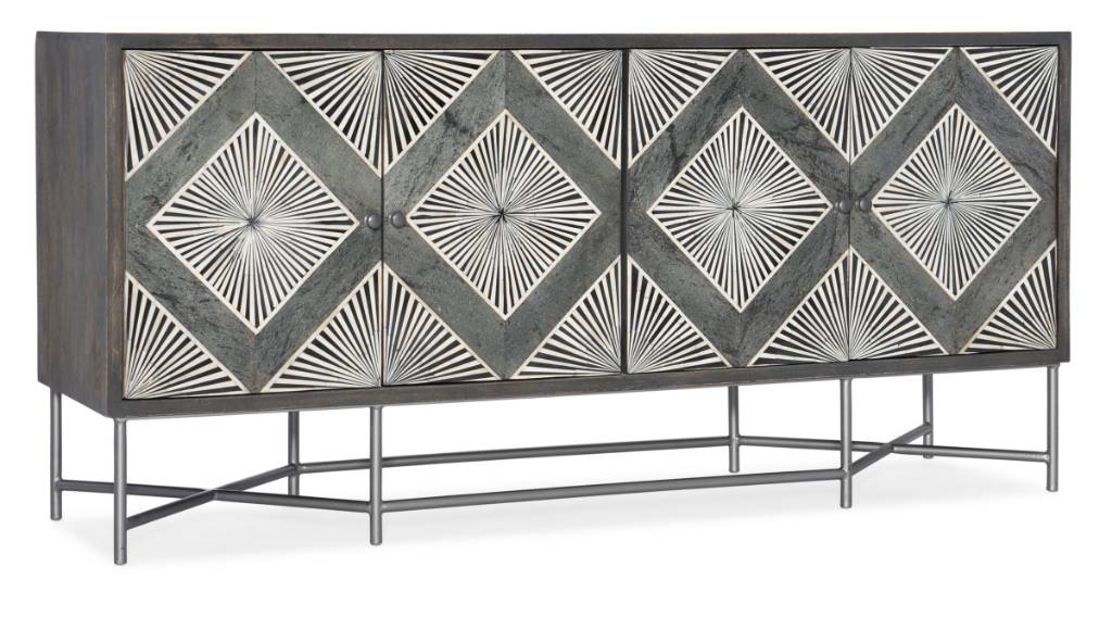 Product Description: Bone Inlay and Slate create a dimensional, kaleidoscope-like pattern on the front of the savvy and stylish Hawthorne Four-Door Credenza. Crafted of Mango Wood, Stone Veneers and Iron, the credenza has a two-tone gray and white finish with a silver metal base and knob hardware.