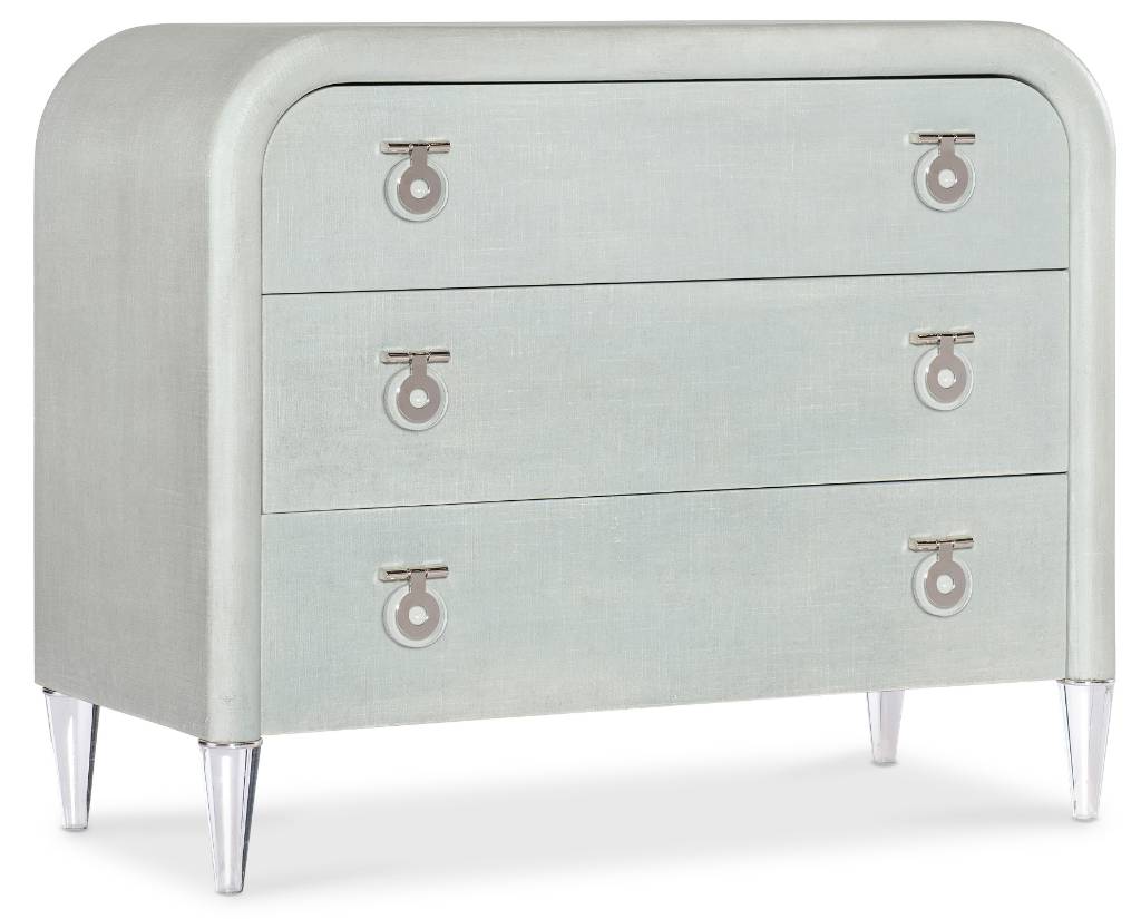 Finish: Light seafoam green linen exterior with clear acrylic legs and silver chrome-colored metal accents. Hardware is clear acrylic and chrome-colored metal drop pulls.