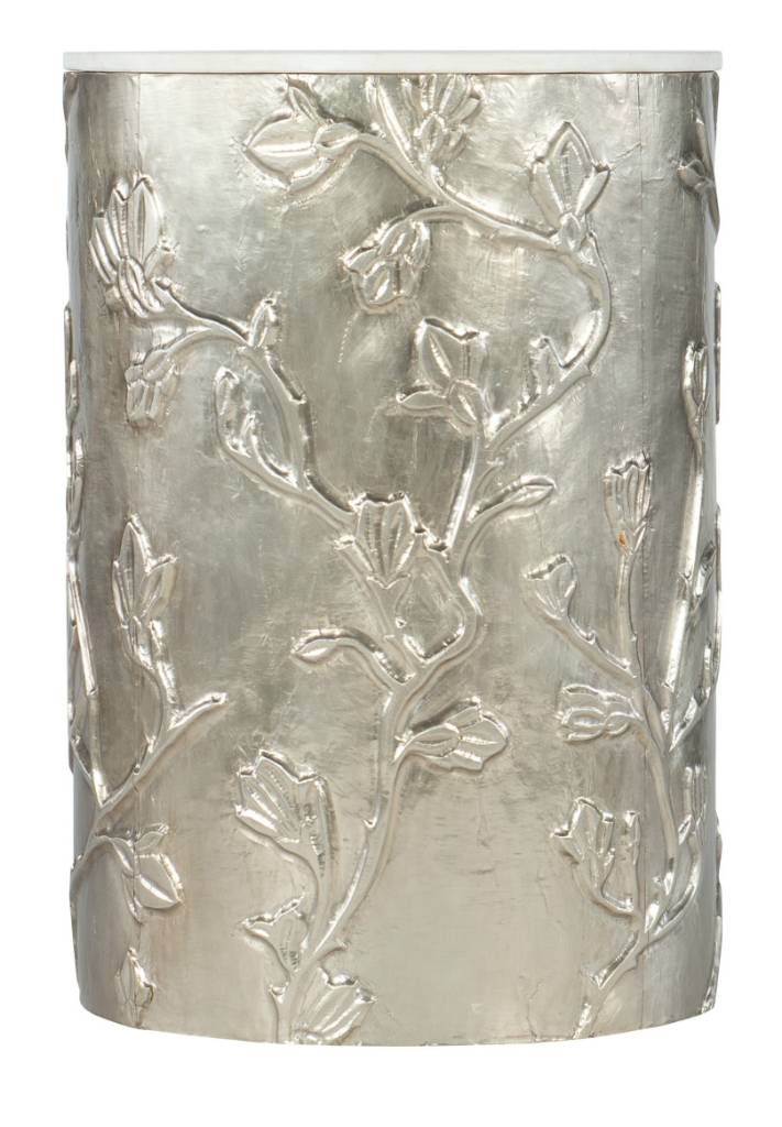 Product Description: Chic and graceful with a mixture of elegant materials, the compact 18 x 18 Raisa round drum table is unforgettable with a German Silver Foil finish featuring a raised leaf motif and a white marble top.