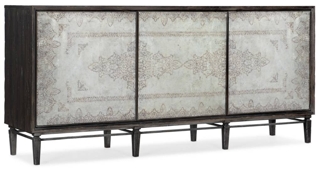 Product Description: Dark and handsome meets shimmery and romantic with the alluring Rosella Console. Hand-painted eglomise glass with a silver leaf pattern on the door fronts is accentuated by an oak veneer case and legs in a rich dark finish. Three doors with soft-close hinges with 2 drawers behind the left door and 2 shelves behind the right pair of doors. Ventilated back panel in the right section to make this piece electronics-ready.