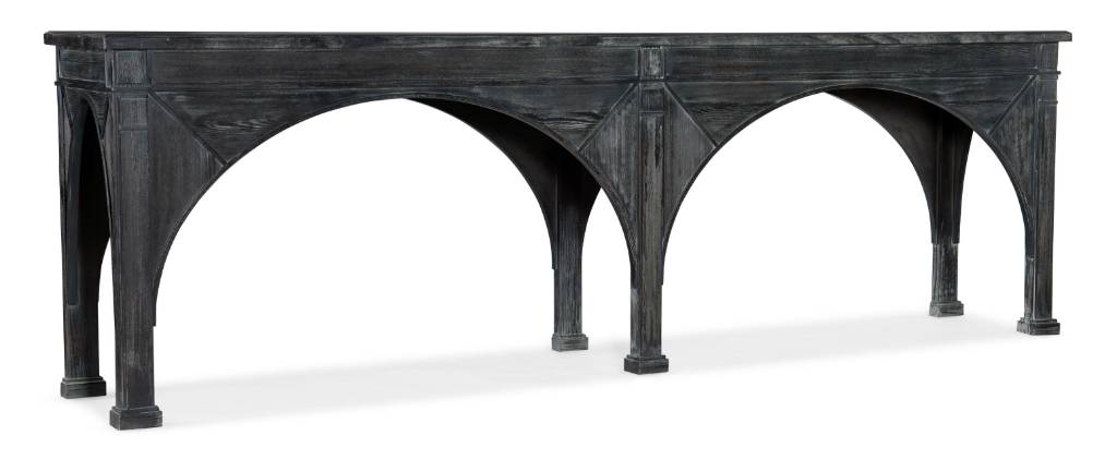 Product Description: Medieval meets metropolitan in this modern console with classical and vintage design elements. In a convenient rectangle shape, the table is crafted of rustic pine veneers with a dark charcoal finish.