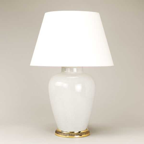 The contrast between the translucent crackled glaze and the ribbed brass base makes this such a distinctive, textural lamp.Glazed Ceramic (Brass Ribbed Base)