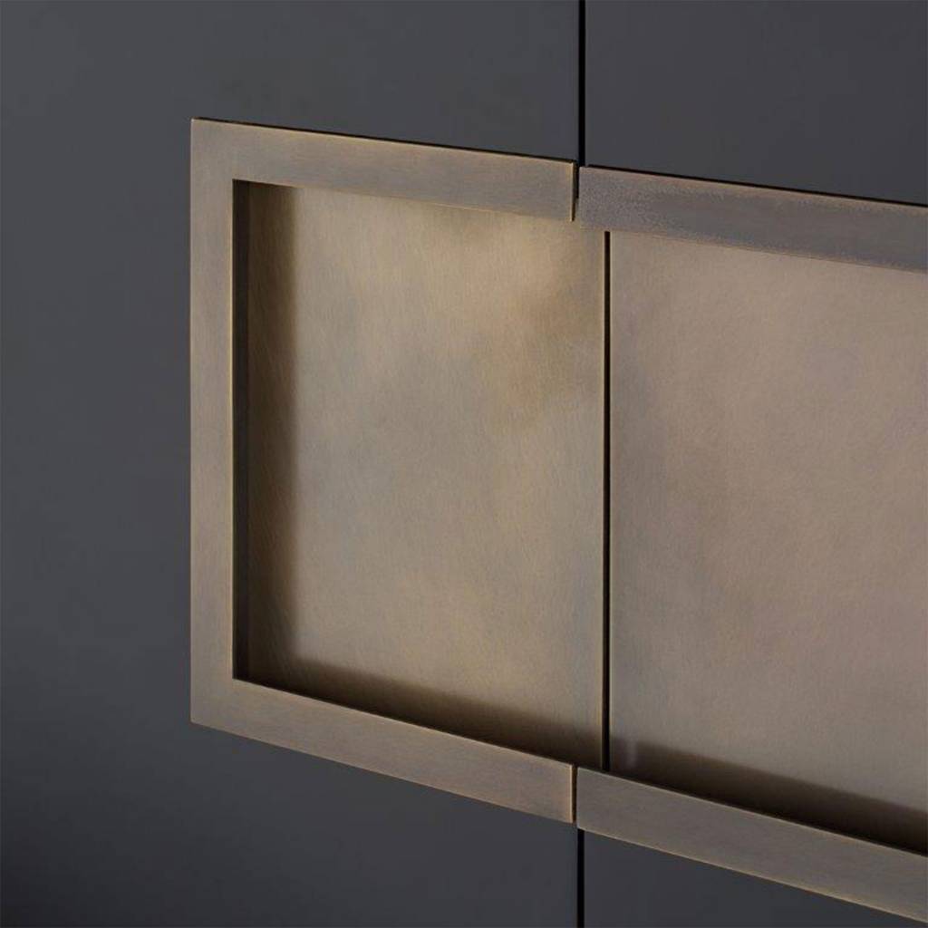 When Nimmo designed this cabinet, he wanted the focal point to be a large, metal handle that covered the width of the cabinet. The Milano was created — customized with two to four doors — to play Nimmo’s famous metalwork against the wood. Its inset handle makes a dramatic statement.