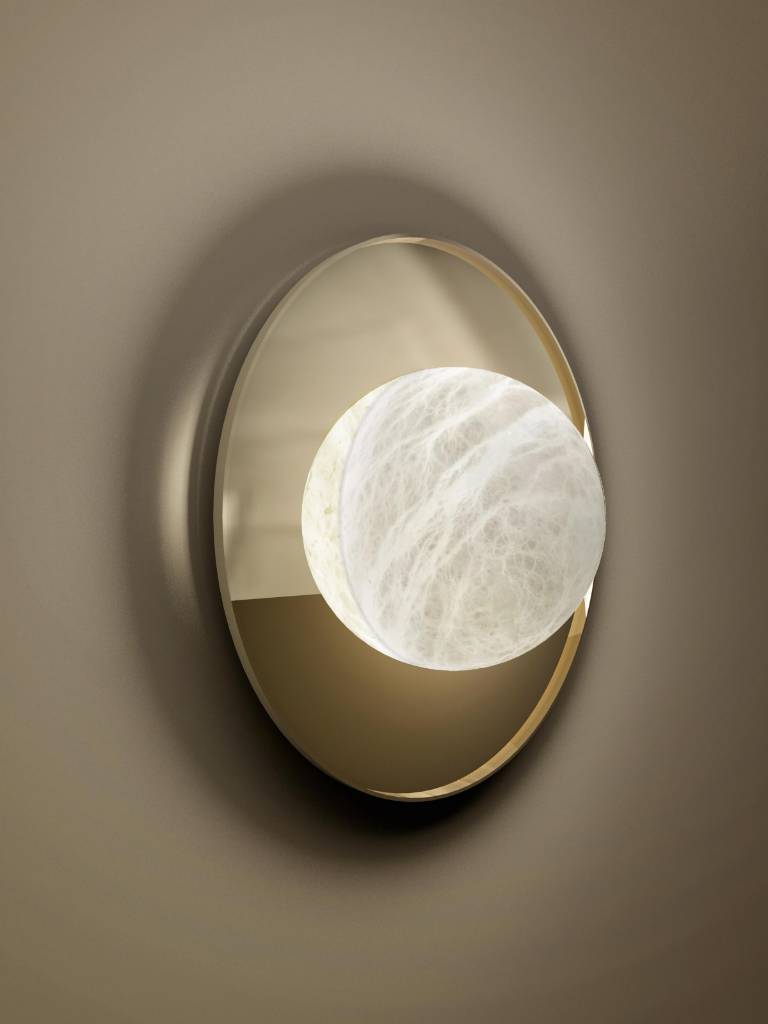 The ingeniously crafted Miso Sconce consists of a half sphere set within a reflective surface, giving the illusion of an illuminated globe suspended in space. Made of highly polished brass, the mirrored backdrop amplifies the striking patterns and luminosity of the alabaster stone light, together casting a warm, soothing glow to the surrounding space. A matching pair sets an inviting tone in an entry or bedroom.