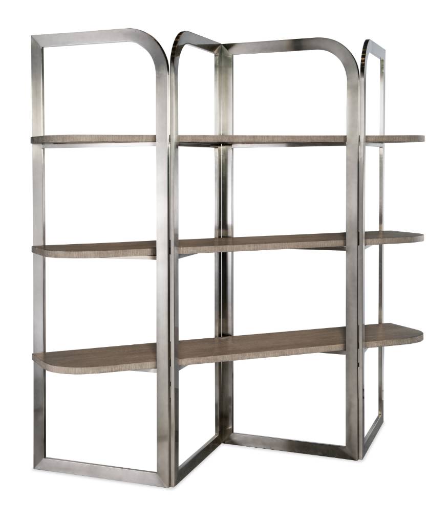 Product Description: Architectural and artistic with a luxe mixture of materials, the Modern Mood Etagere has three fixed shelves crafted of wire-brushed Quartered Oak in the Mink finish with dark, earthy brown hues with notes of black. The shelves are surrounded by a shaped brushed metal frame in a warm pewter-colored finish. Finished all the way around, the shelf can be used from either side and can float in a room.