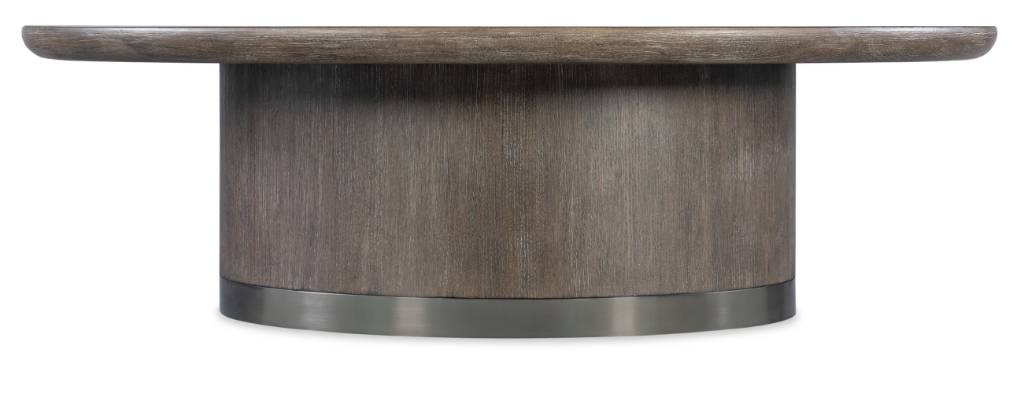 Product Description: Sleek and stylish with a simple and timeless round profile, the Modern Mood Cocktail Table combines Quartered Oak Veneers with a metal-wrapped band around the base in a warm pewter finish. Crafted of Quartered Oak Veneers in a dark Mink finish, the table has matched veneers on the top and is finished on all sides.
