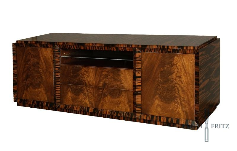 This beautiful creation is a 1940's Cubist Hollywood glamour server in Walnut crotch door and drawer fronts with Coromandel Ebony bolection mouldings and sides.Customization Available